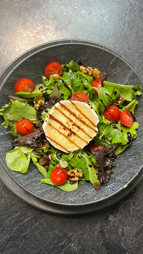 Ensalada mézclum, tomates cherry, nueces, pasas y rulo de cabra